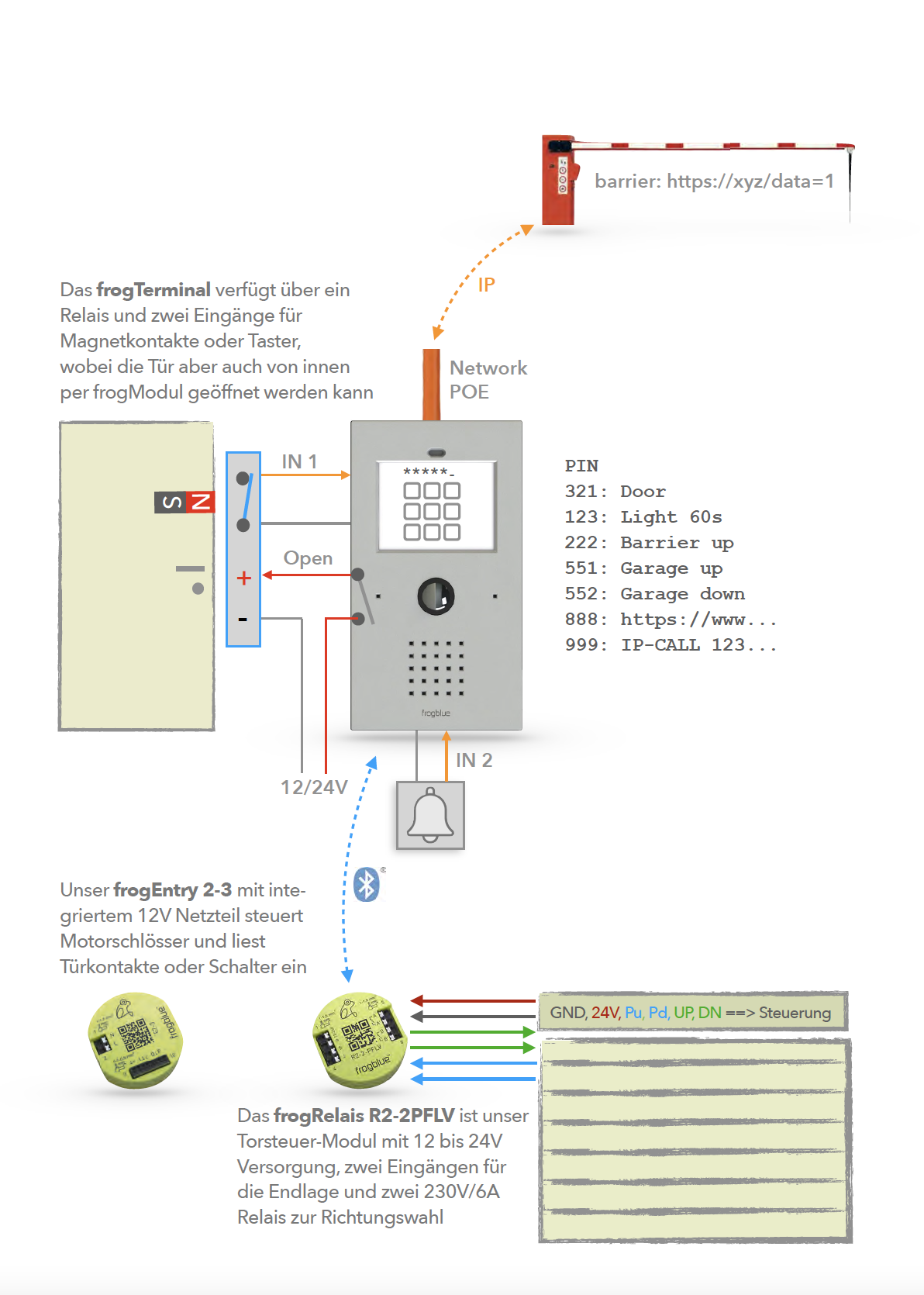 - Die frogblue Video-Türsprechstelle frogTerminal basiert direkt auf dem integrierten SIP-Telefon-Weltstandard und unterstützt Mehrparteien-Szenarien bis hin zu verteilten Großprojekten. Die Stärke liegt dabei in der gleichzeitigen Einbindung mehrerer SIP-Telefonanlagen und SIP-Server ohne Zusatzhardware.